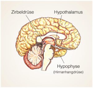 Die Zirbeldrüse wandelt, das am Tage im Gehirn gebildete Serotonin, in der Dunkelheit der Nacht in Melatonin um. Bei beiden Hormonen handelt es sich um sogenannte Neurotransmitter. Das sind körpereigene Botenstoffe, die als Verbindungsstellen in allen Nervenzellen des Körpers fungieren und von dort aus die elektrischen Impulse weiterleiten. Serotonin ist als das Glückshormon bekannt, das eine entspannende und stark stimmungsaufhellende Wirkung auf uns Menschen hat. Melatonin ist das Hormon, das unseren Wach-Schlaf-Rhythmus steuert. Die Melatoninproduktion wird über den Lichteinfall auf die Netzhaut des Auges gesteuert und steigt in der Dunkelheit an. Melatonin ist jedoch nicht nur für einen geruhsamen Schlaf von immenser Bedeutung, denn es verfügt zusätzlich über ein ausser gewöhnlich starkes antioxidatives Potential, wodurch Zellschäden wirksam reduziert werden. Studien zufolge soll es als Antioxidan eine vielfach grössere Wirkung zeigen als beispielsweise das zu Therapiezwecken häufig verwendete synthetische Antioxidans DMSO.